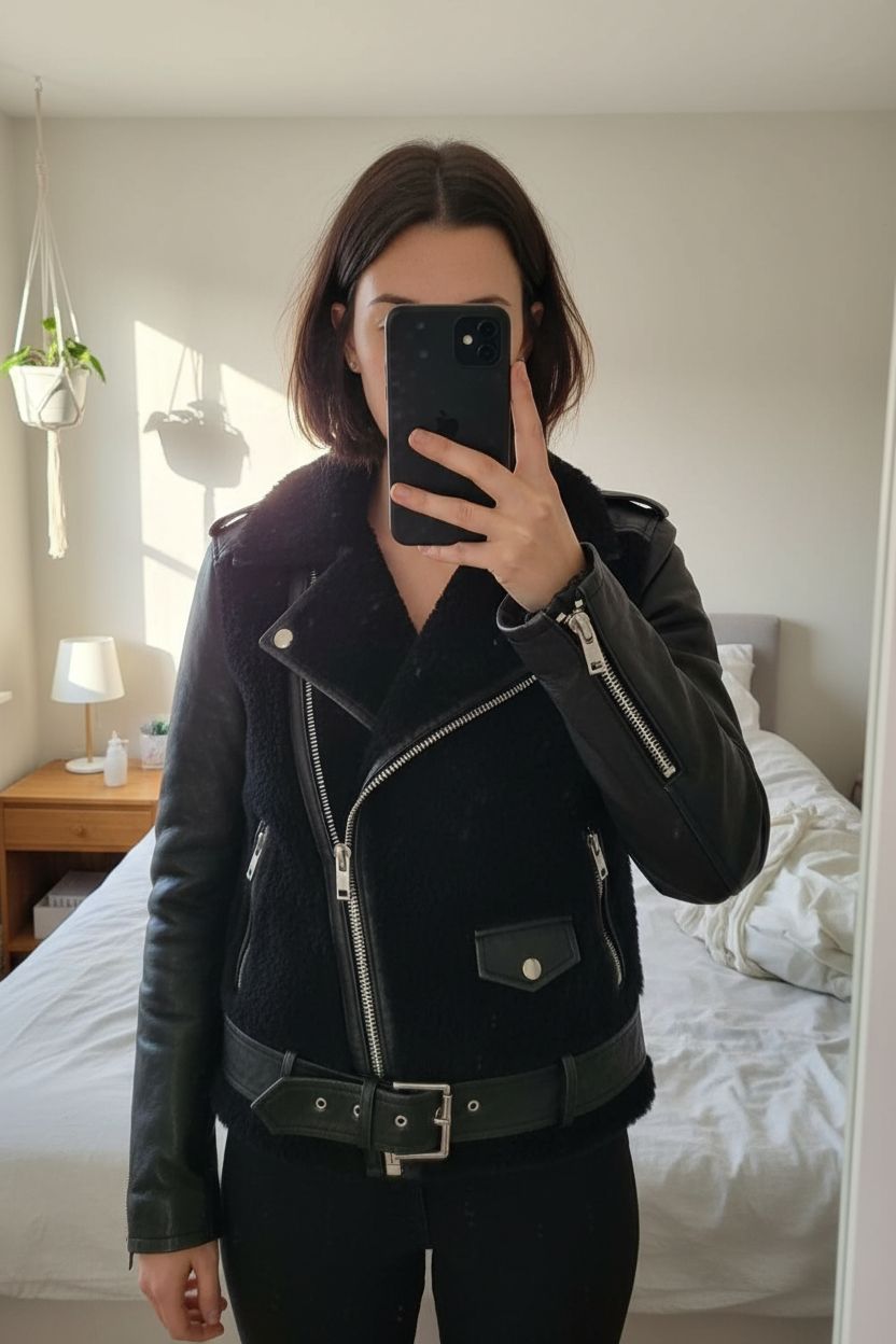Veste cuir perfecto Schott Xs debout, face à la caméra, dans une chambre à la lumière douce, avec une lumière naturelle filtrant par la fenêtre.