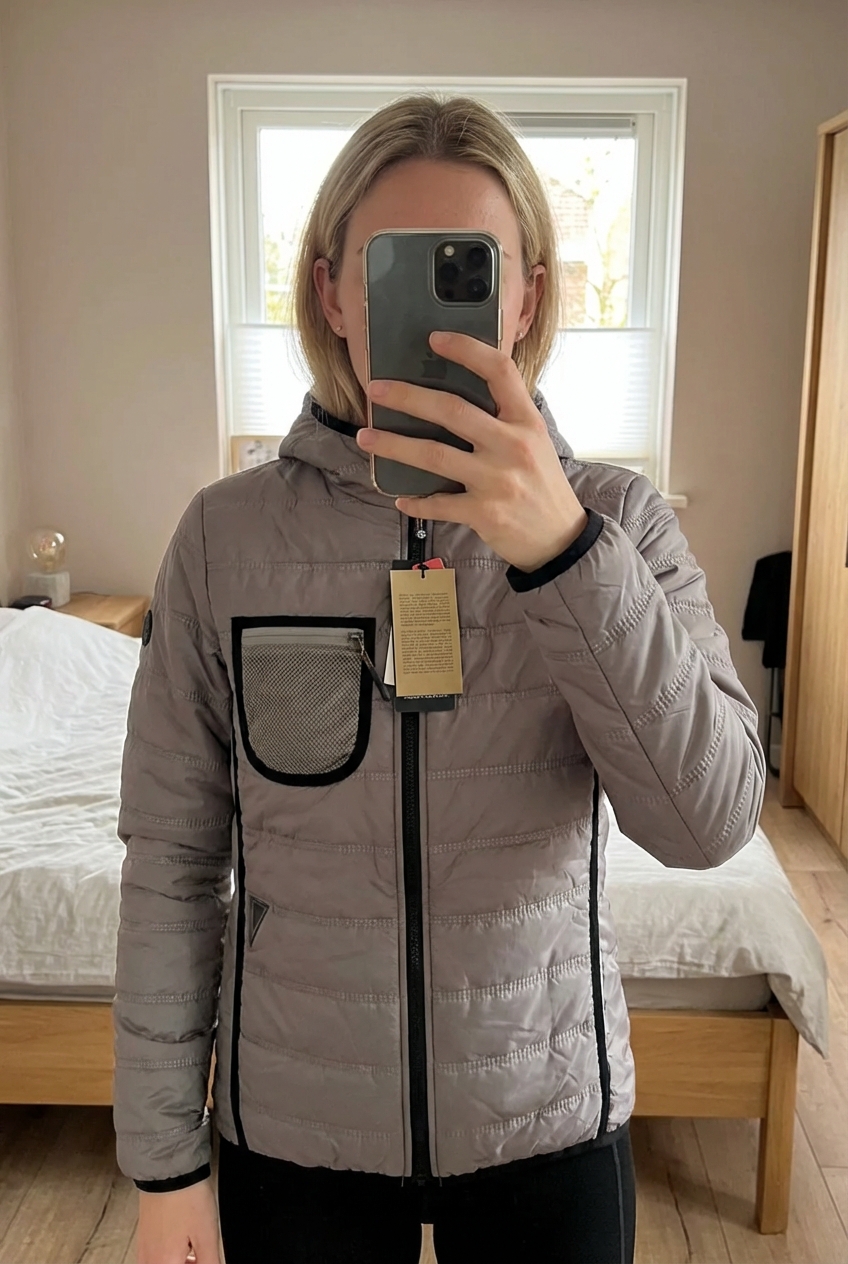 Veste cyclisme AGU fuse venture debout, face à la caméra, dans une chambre à la lumière douce, avec une lumière naturelle filtrant par la fenêtre.