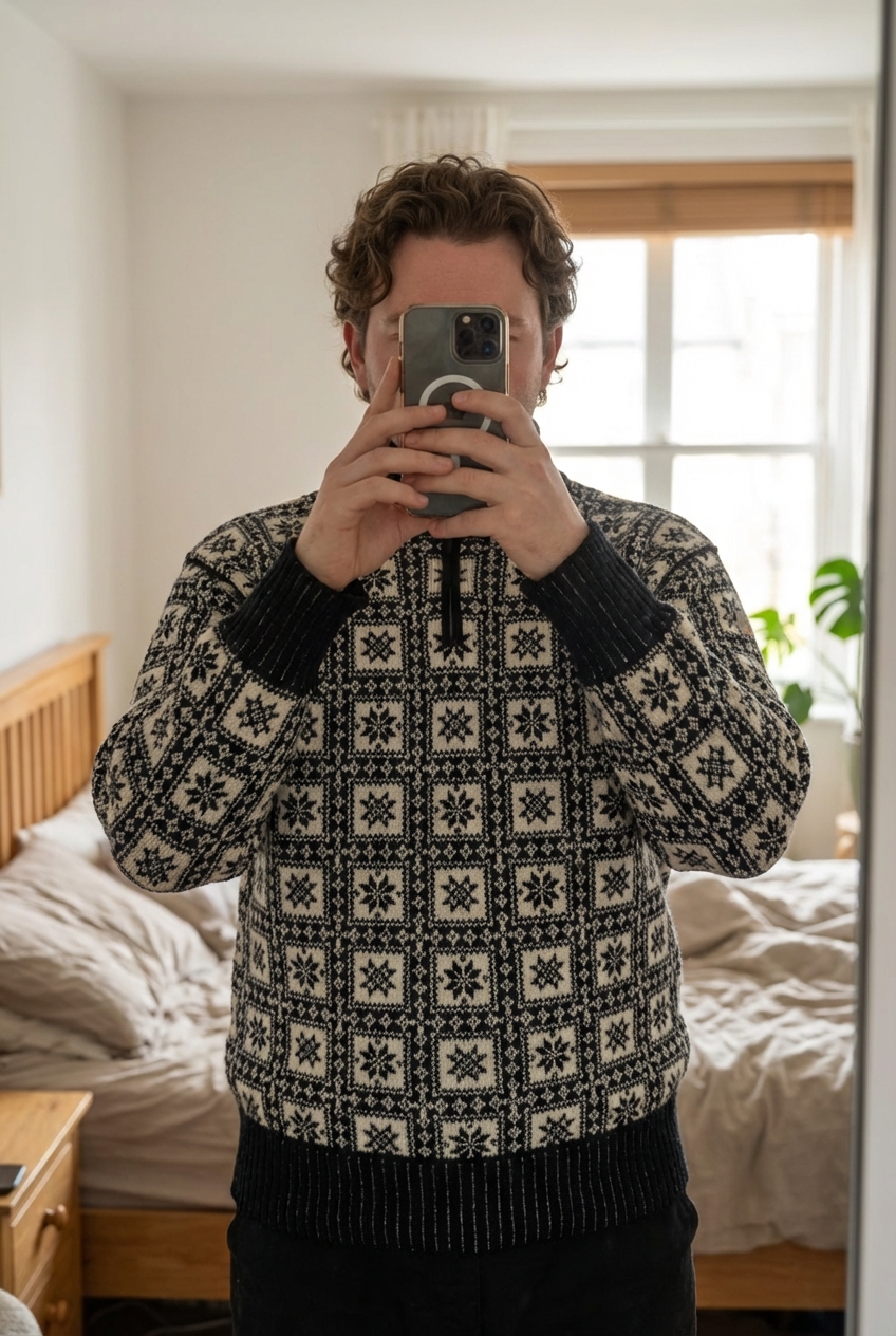 Une personne en Veste Dale Of Norway Norvegian Made in Norway Dale Casual Fait Main Tricot 100% Laine Noir L debout, face à la caméra, avec une silhouette légèrement plus ronde, dans une chambre à la lumière douce, avec une lumière naturelle filtrant par la fenêtre.