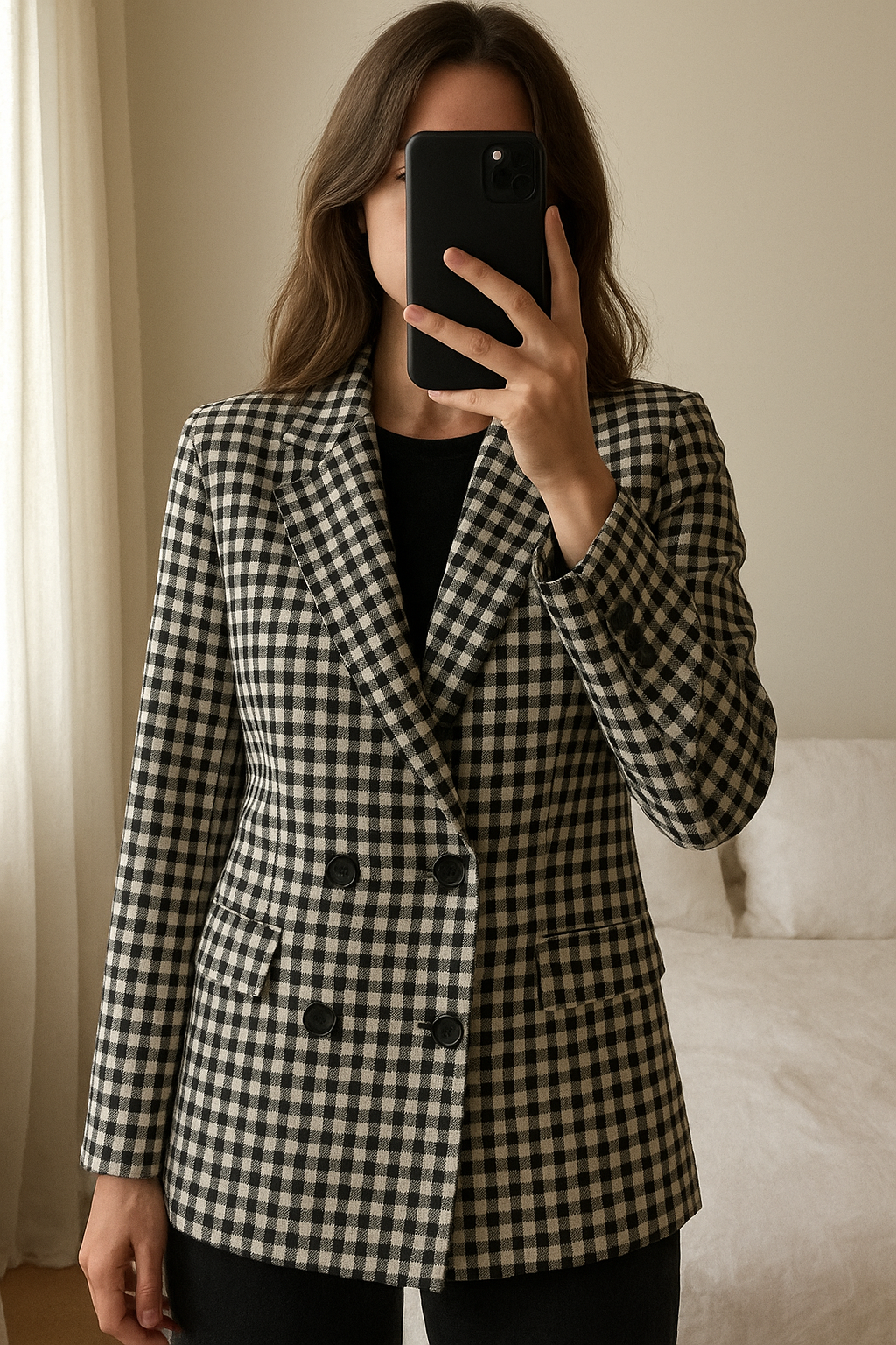 Veste de blazer à carreaux debout, face à la caméra, dans une chambre à la lumière douce, avec une lumière naturelle filtrant par la fenêtre.