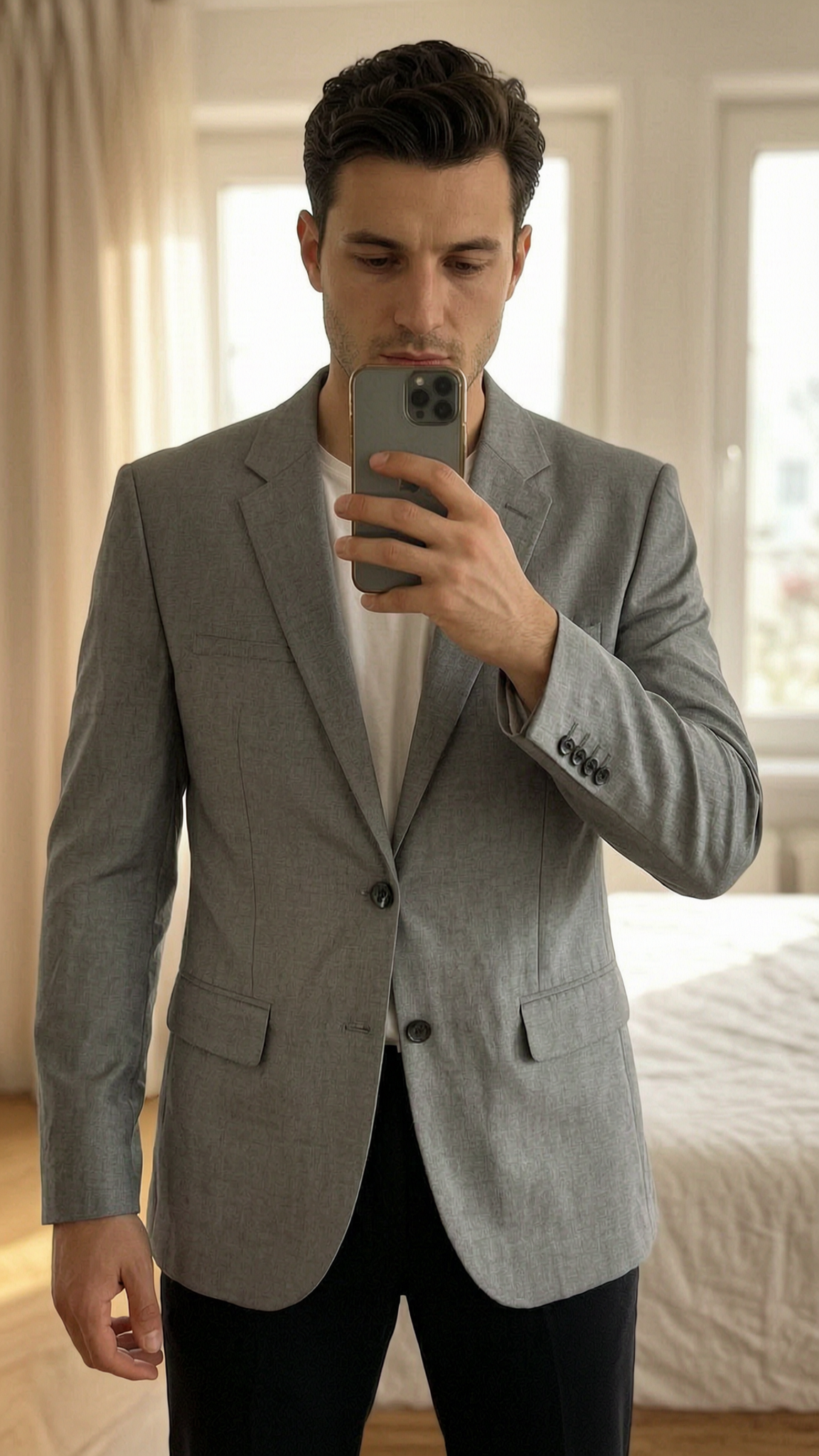Veste de costume debout, face à la caméra, dans une chambre à la lumière douce, avec une lumière naturelle filtrant par la fenêtre.