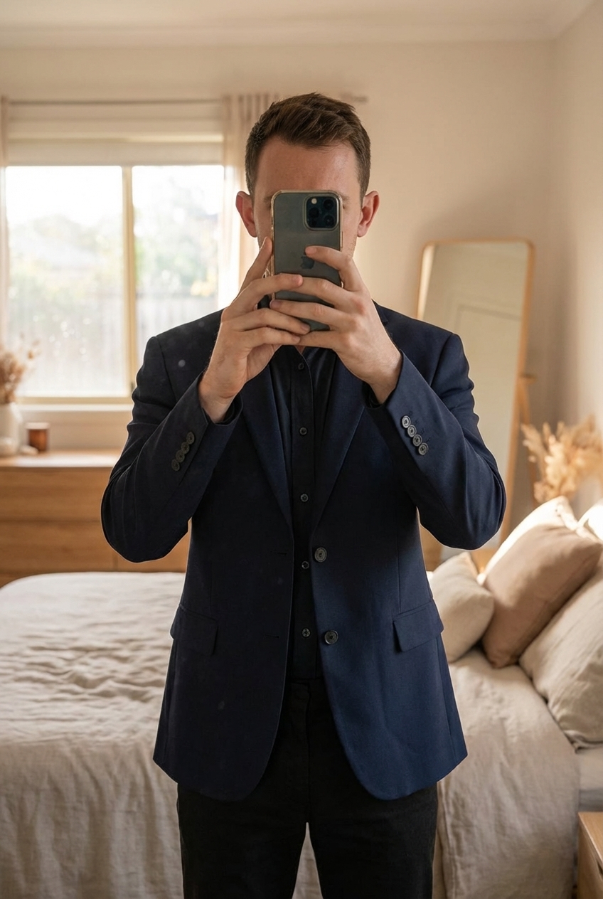 Veste de costume homme Zara noir T46 debout, face à la caméra, dans une chambre à la lumière douce, avec une lumière naturelle filtrant par la fenêtre.