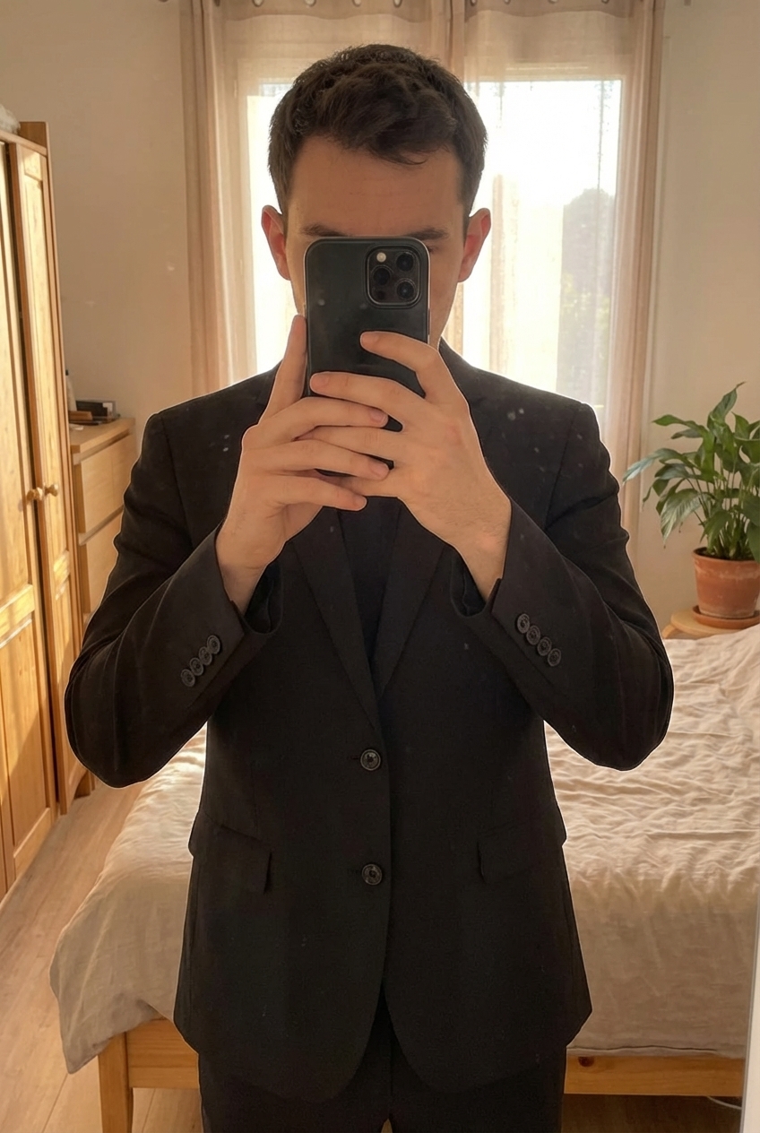 Veste de costume noire S/M Homme debout, face à la caméra, dans une chambre à la lumière douce, avec une lumière naturelle filtrant par la fenêtre.