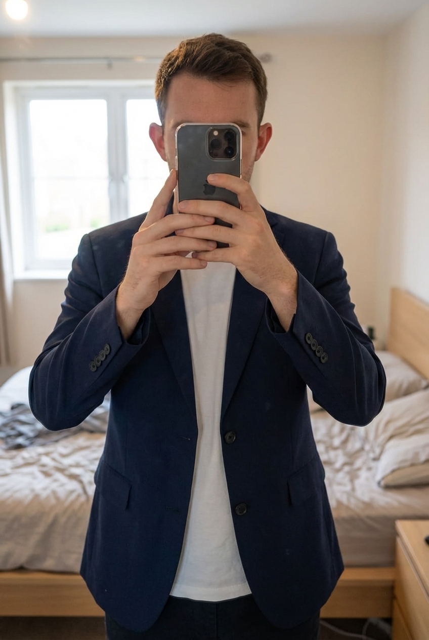 Veste de costume slim fit bleu marine mango man debout, face à la caméra, dans une chambre à la lumière douce, avec une lumière naturelle filtrant par la fenêtre.