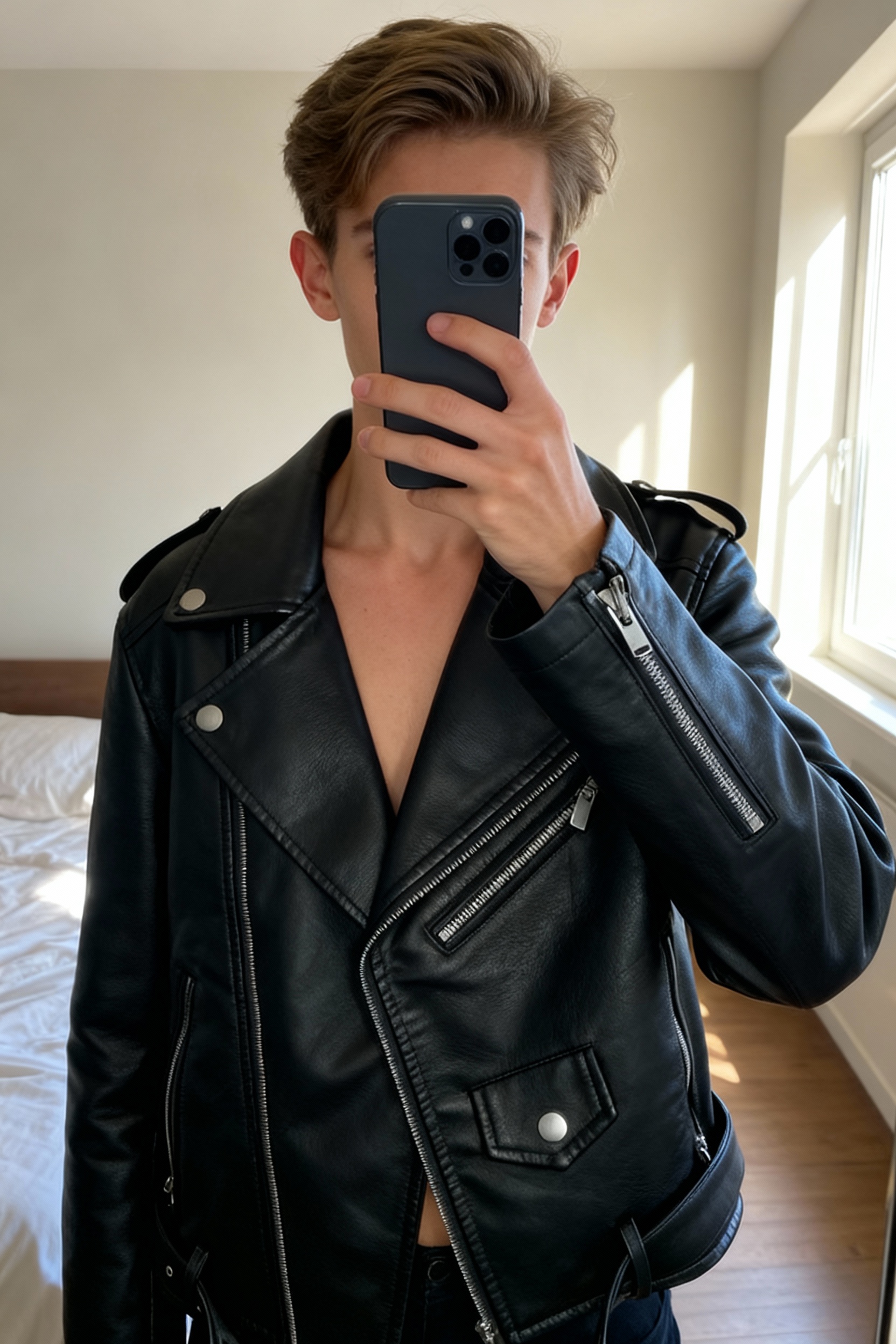 Veste en cuir / perfecto debout, face à la caméra, dans une chambre à la lumière douce, avec une lumière naturelle filtrant par la fenêtre.