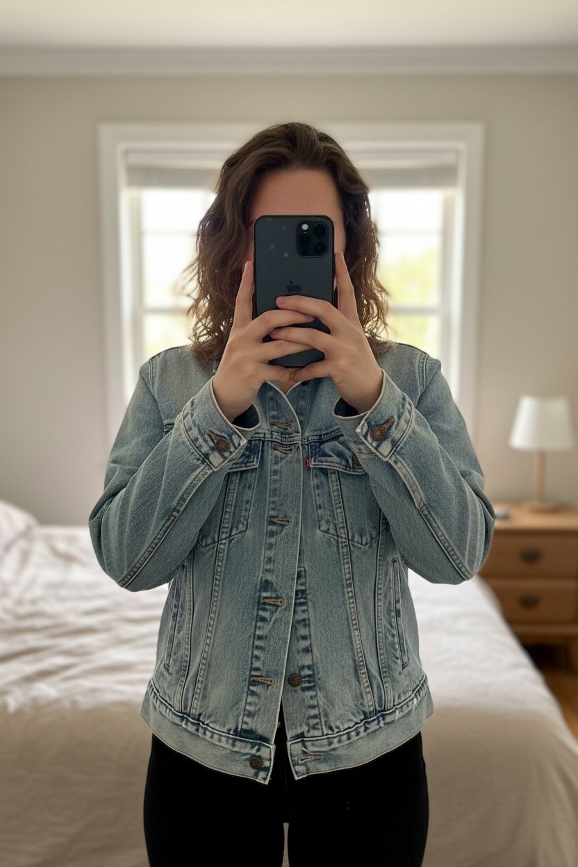 Veste en jean Levis debout, face à la caméra, dans une chambre à la lumière douce, avec une lumière naturelle filtrant par la fenêtre.
