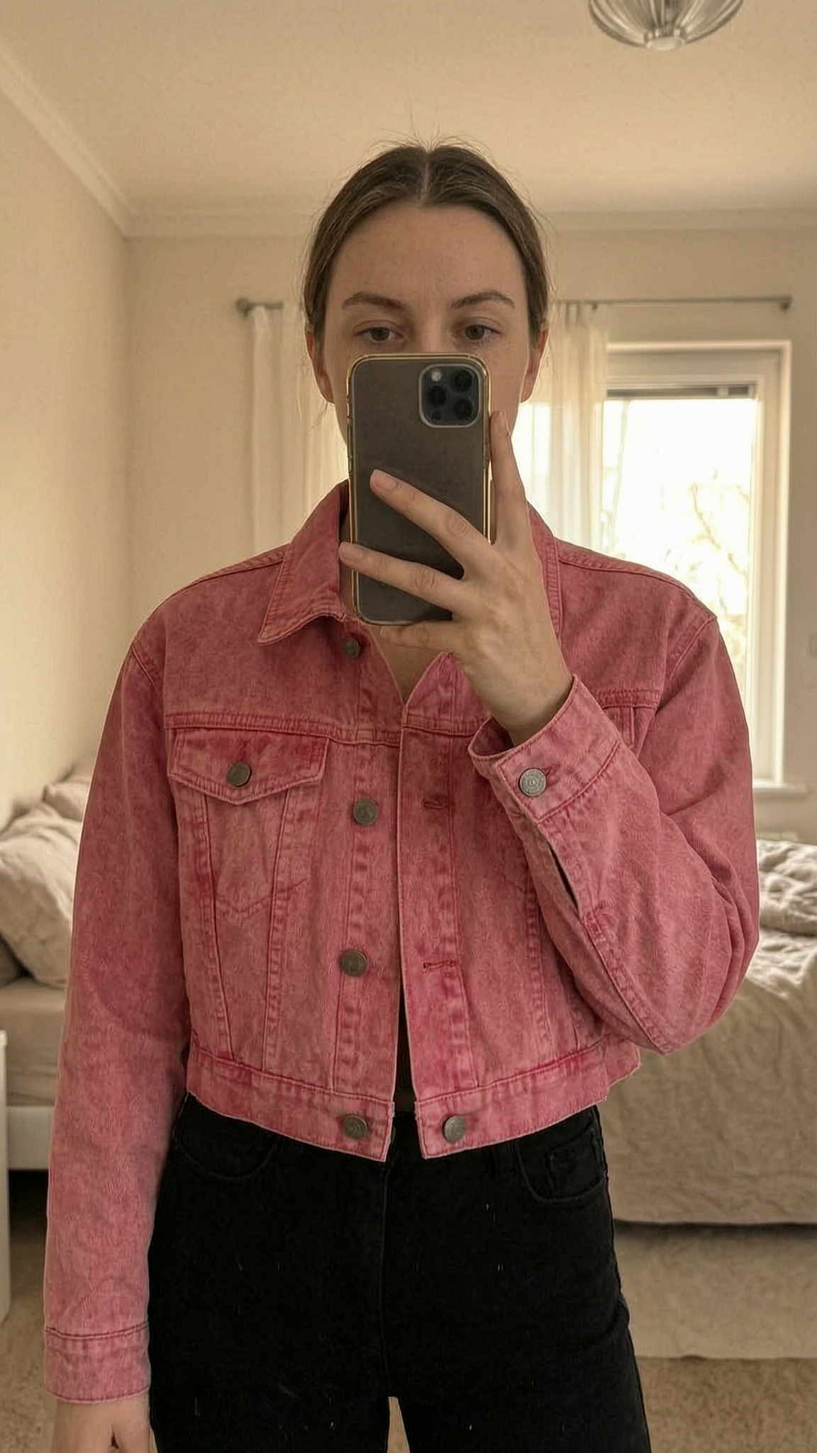Veste en jean Zara rose S debout, face à la caméra, dans une chambre à la lumière douce, avec une lumière naturelle filtrant par la fenêtre.