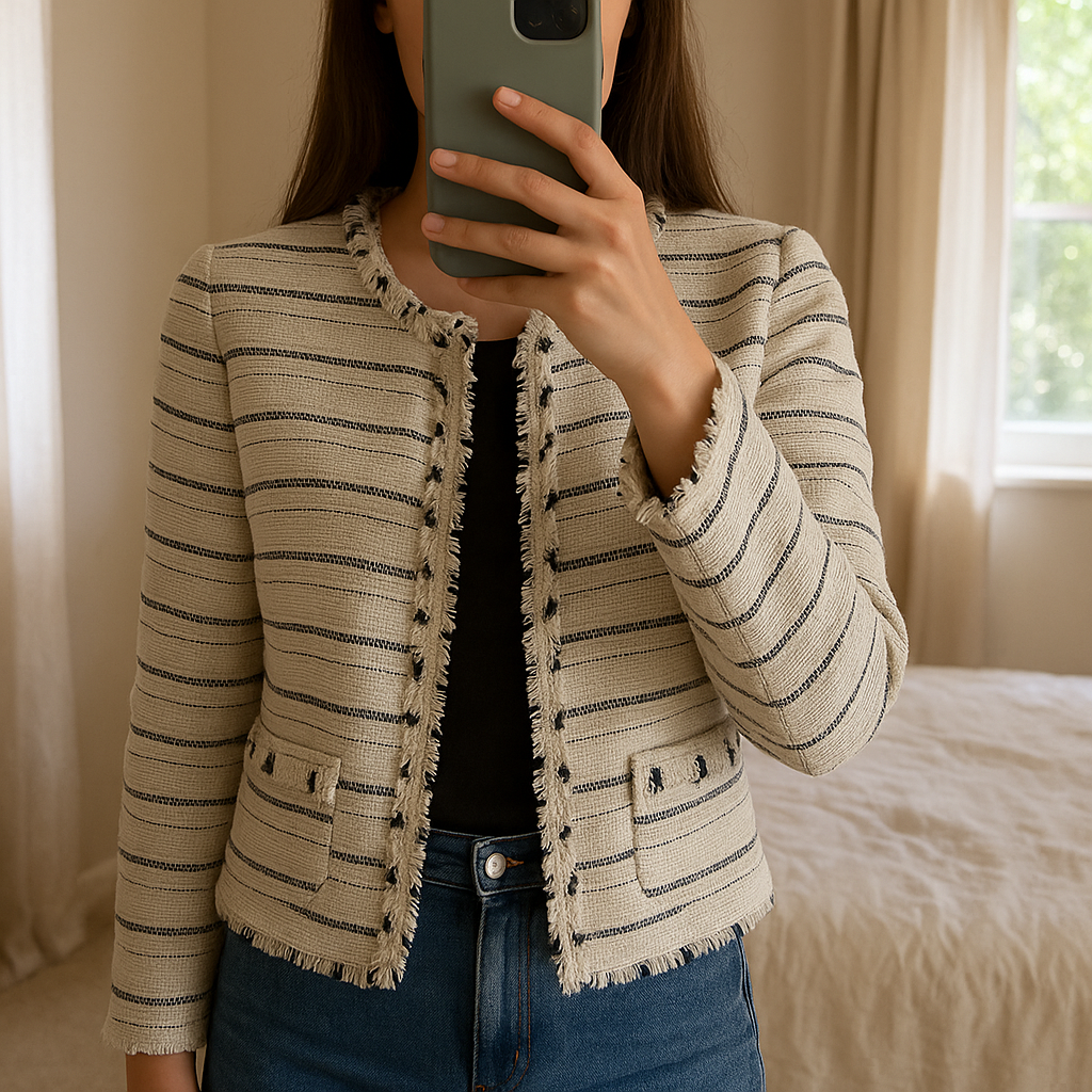 Veste femme taille 40 debout, face à la caméra, dans une chambre à la lumière douce, avec une lumière naturelle filtrant par la fenêtre.