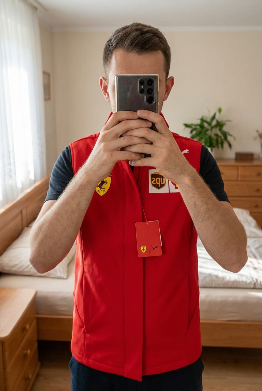 Veste Ferrari Puma – Officielle Scuderia Ferrari debout, face à la caméra, dans une chambre à la lumière douce, avec une lumière naturelle filtrant par la fenêtre.