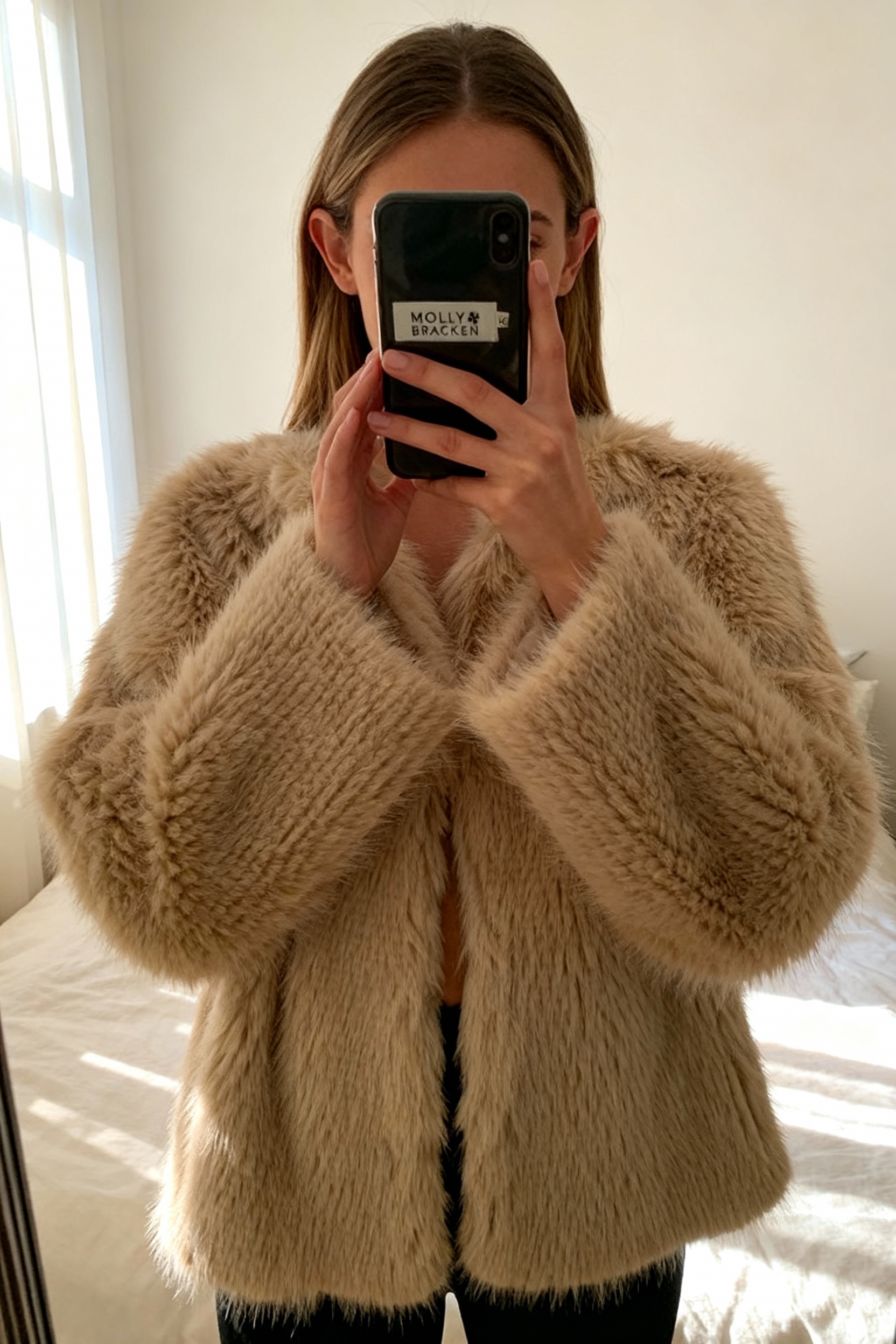 Veste fourrure Molly Bracken debout, face à la caméra, dans une chambre à la lumière douce, avec une lumière naturelle filtrant par la fenêtre.