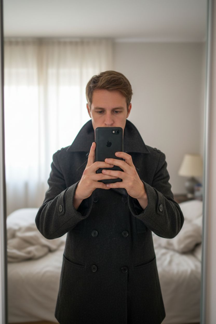 Veste H-landers neuve taille L debout, face à la caméra, dans une chambre à la lumière douce, avec une lumière naturelle filtrant par la fenêtre.