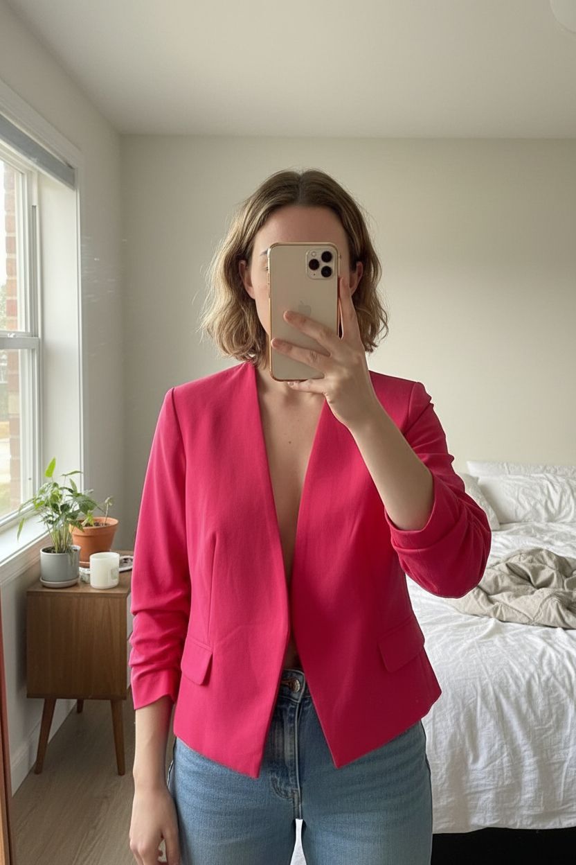 Veste h&m taille 38 debout, face à la caméra, dans une chambre à la lumière douce, avec une lumière naturelle filtrant par la fenêtre.