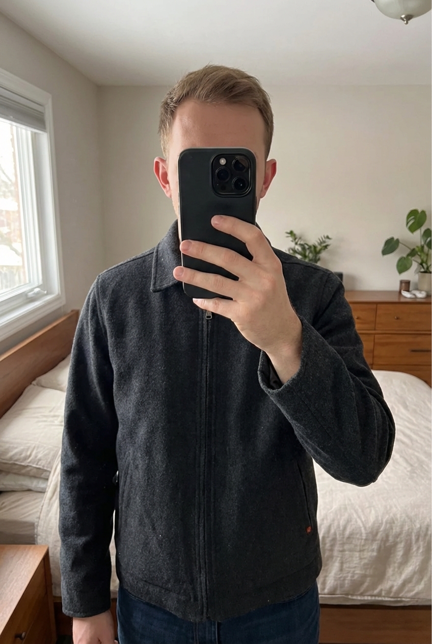 Veste Harrington en Laine et cuir véritable Vintage AberCrombie Gris L debout, face à la caméra, dans une chambre à la lumière douce, avec une lumière naturelle filtrant par la fenêtre.