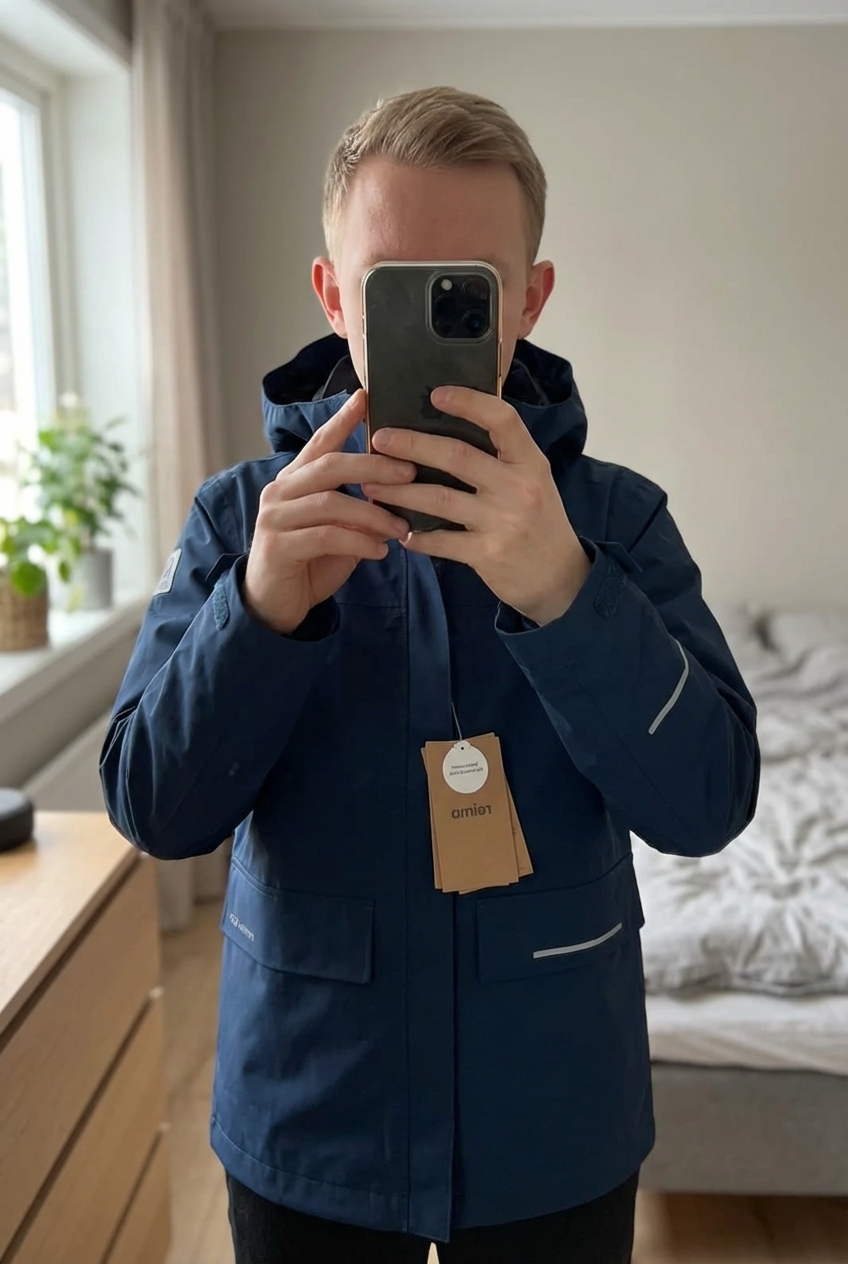 Veste imperméable enfants Reima voyageur neuve debout, face à la caméra, dans une chambre à la lumière douce, avec une lumière naturelle filtrant par la fenêtre.