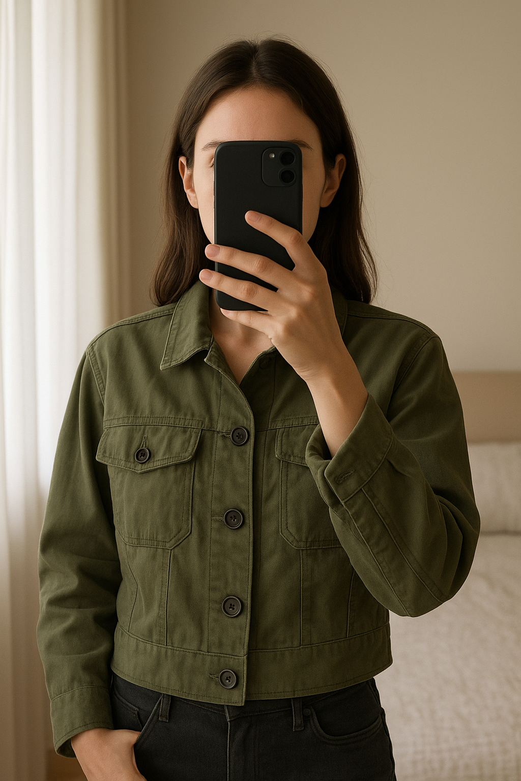 Veste Jennifer taille s debout, face à la caméra, dans une chambre à la lumière douce, avec une lumière naturelle filtrant par la fenêtre.