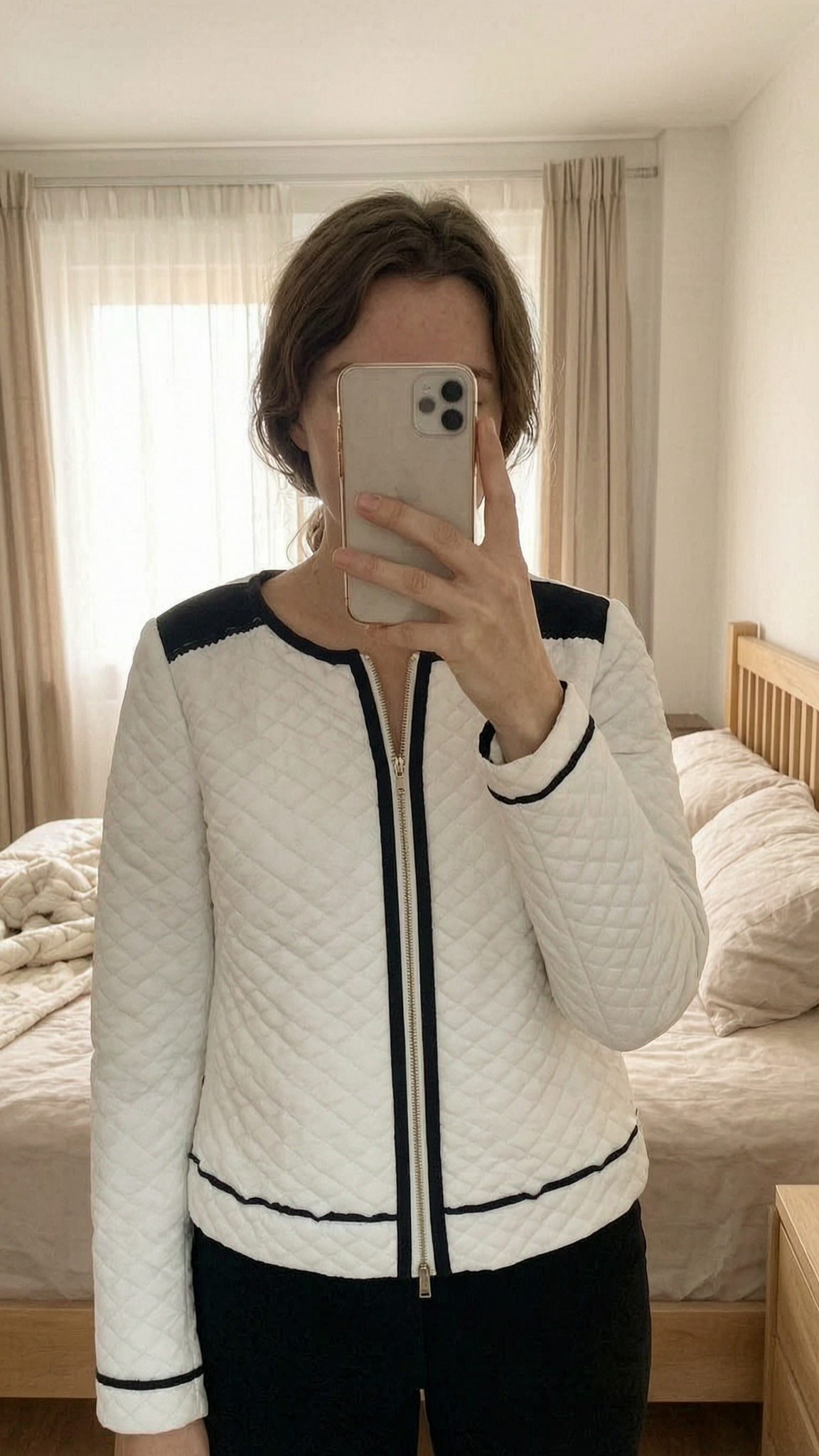 Veste légère cache cache 36 debout, face à la caméra, dans une chambre à la lumière douce, avec une lumière naturelle filtrant par la fenêtre.