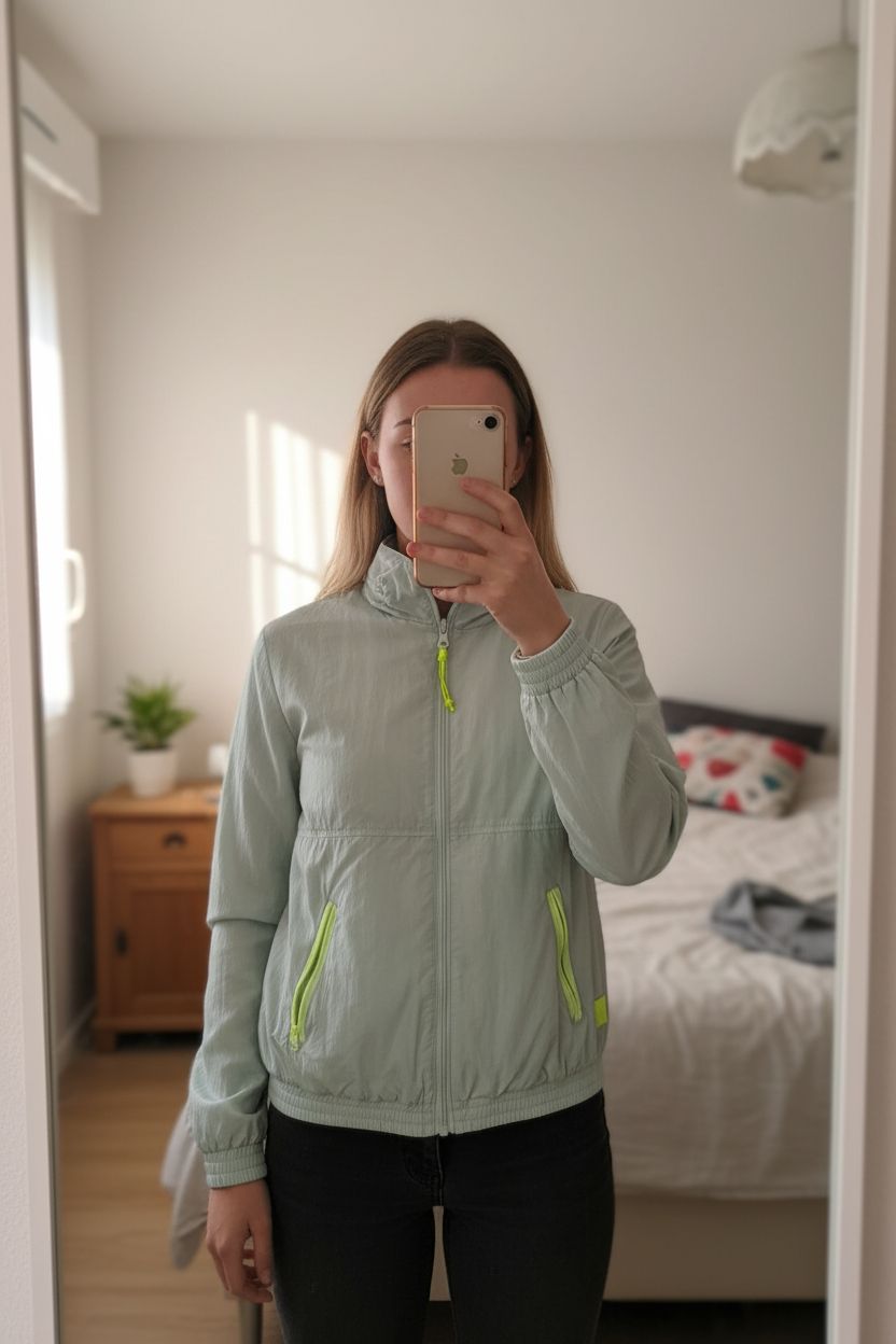 Veste légère taille 34 bizzbee excellent état debout, face à la caméra, dans une chambre à la lumière douce, avec une lumière naturelle filtrant par la fenêtre.