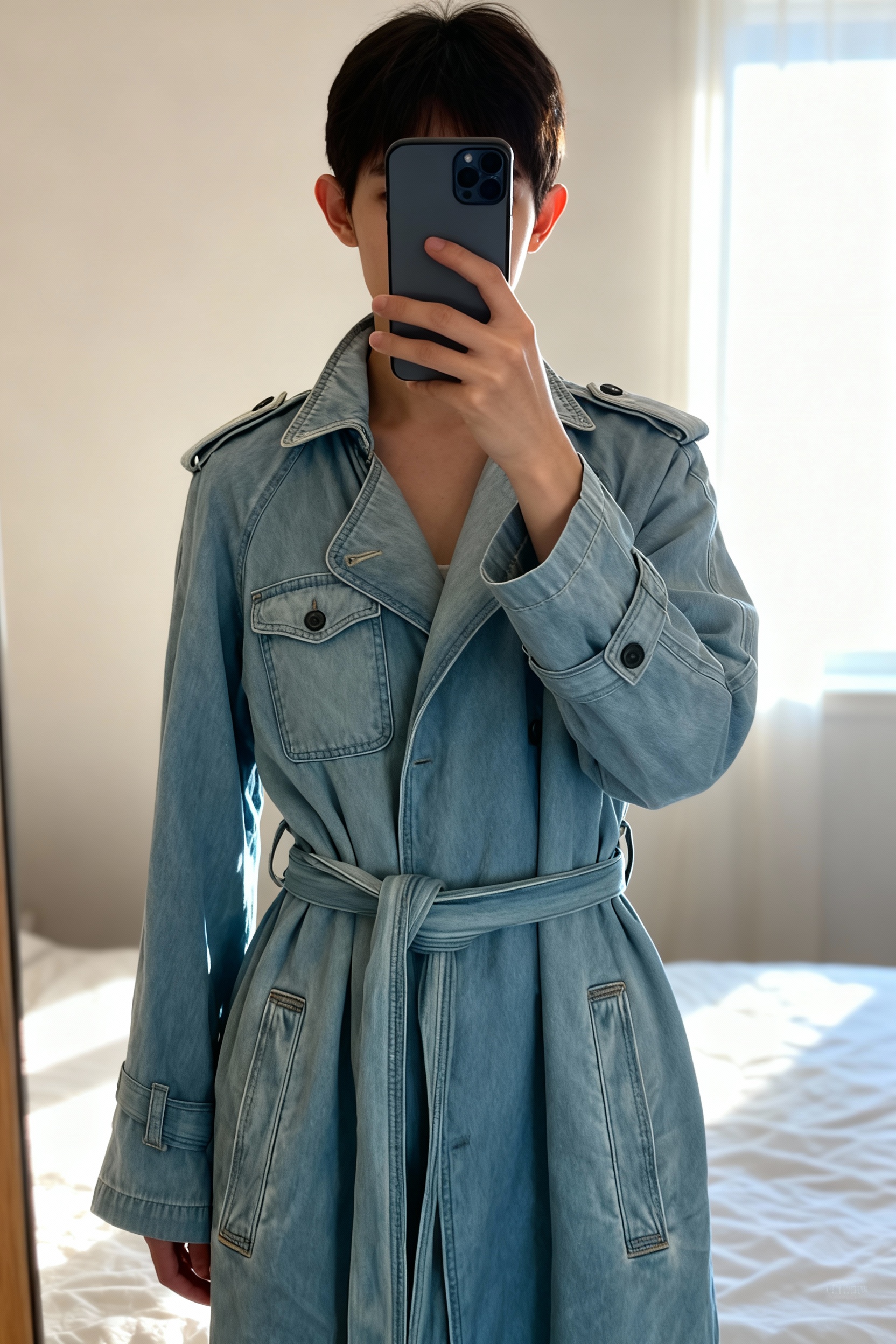 Veste longue en jean debout, face à la caméra, dans une chambre à la lumière douce, avec une lumière naturelle filtrant par la fenêtre.