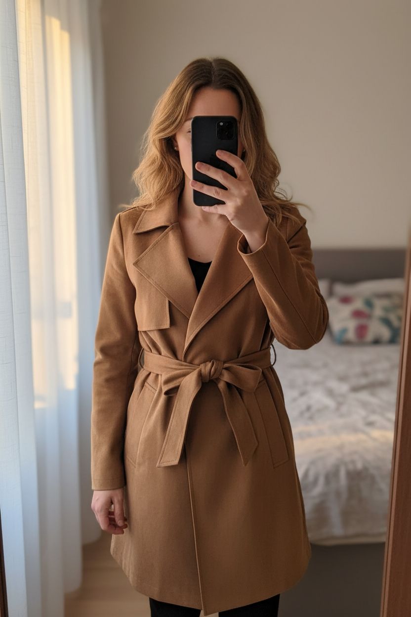 Veste longue en suédine debout, face à la caméra, dans une chambre à la lumière douce, avec une lumière naturelle filtrant par la fenêtre.