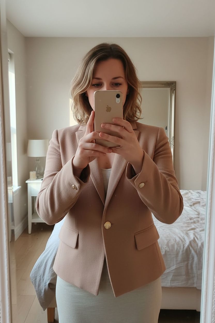 Veste MANGO Taille S viscose et polyester debout, face à la caméra, dans une chambre à la lumière douce, avec une lumière naturelle filtrant par la fenêtre.