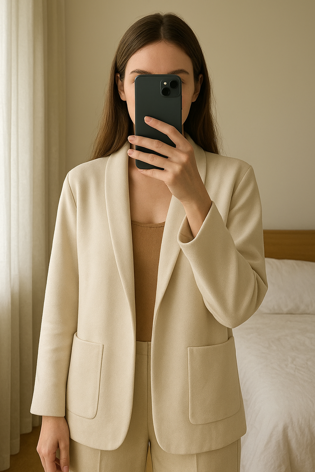 Veste mi-longue légère effet daim crème debout, face à la caméra, dans une chambre à la lumière douce, avec une lumière naturelle filtrant par la fenêtre.