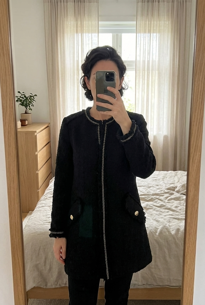 Veste mi longue Zara debout, face à la caméra, dans une chambre à la lumière douce, avec une lumière naturelle filtrant par la fenêtre.