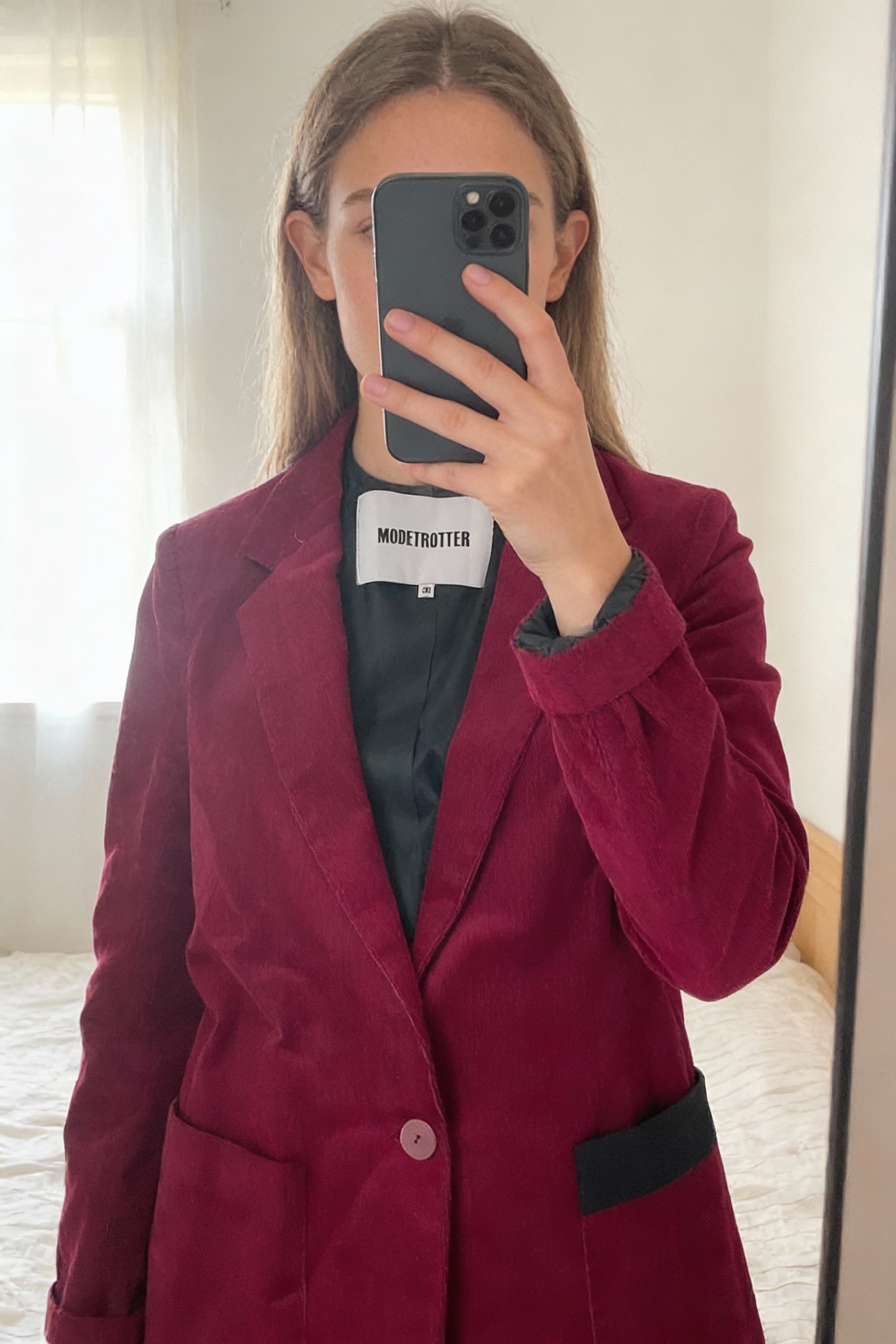 Veste modetrotter debout, face à la caméra, dans une chambre à la lumière douce, avec une lumière naturelle filtrant par la fenêtre.