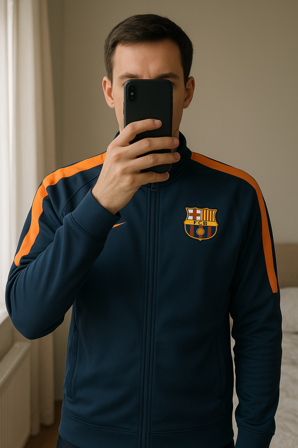 🚨 Veste Nike FC Barcelone Officielle – Taille M debout, face à la caméra, dans une chambre à la lumière douce, avec une lumière naturelle filtrant par la fenêtre.