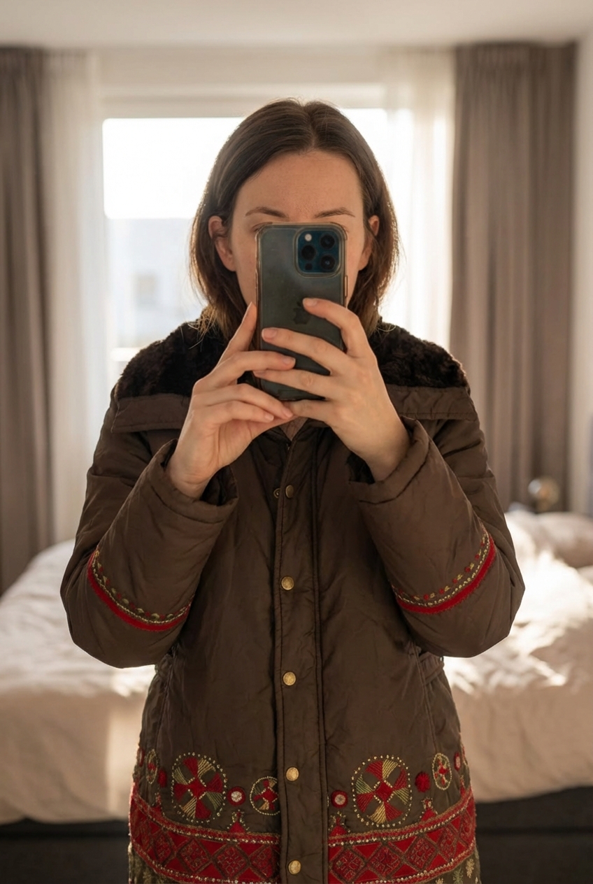 Veste parka femme debout, face à la caméra, dans une chambre à la lumière douce, avec une lumière naturelle filtrant par la fenêtre.