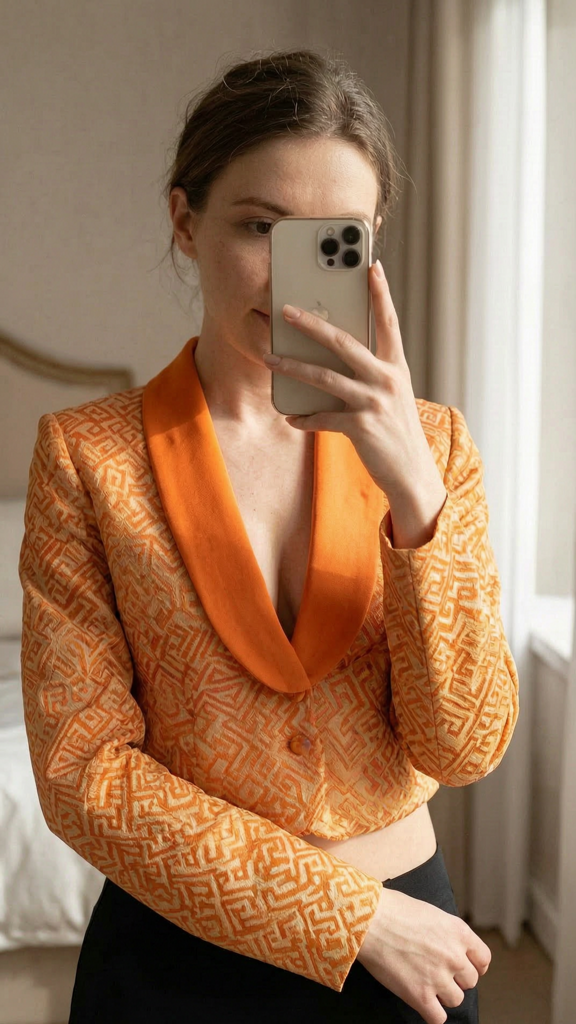 Veste Patrizia Pepe taille 40 debout, face à la caméra, dans une chambre à la lumière douce, avec une lumière naturelle filtrant par la fenêtre.