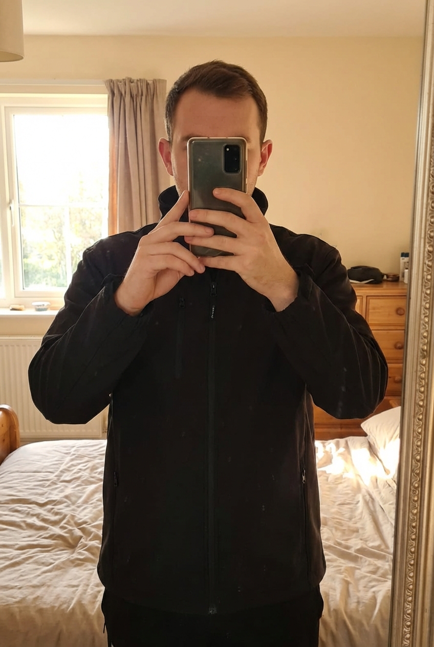 Veste payper debout, face à la caméra, dans une chambre à la lumière douce, avec une lumière naturelle filtrant par la fenêtre.