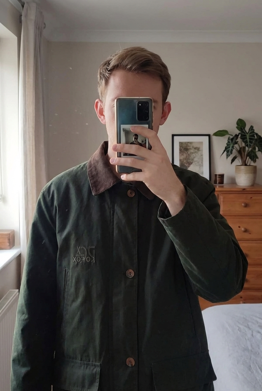 Veste Peter Cofox verte debout, face à la caméra, dans une chambre à la lumière douce, avec une lumière naturelle filtrant par la fenêtre.