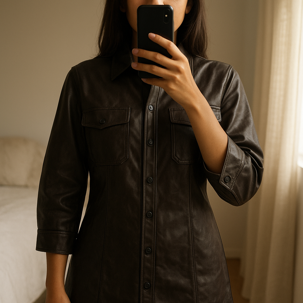 Une personne en Veste pression Pimkie debout, face à la caméra, avec une silhouette fine, dans une chambre à la lumière douce, avec une lumière naturelle filtrant par la fenêtre.