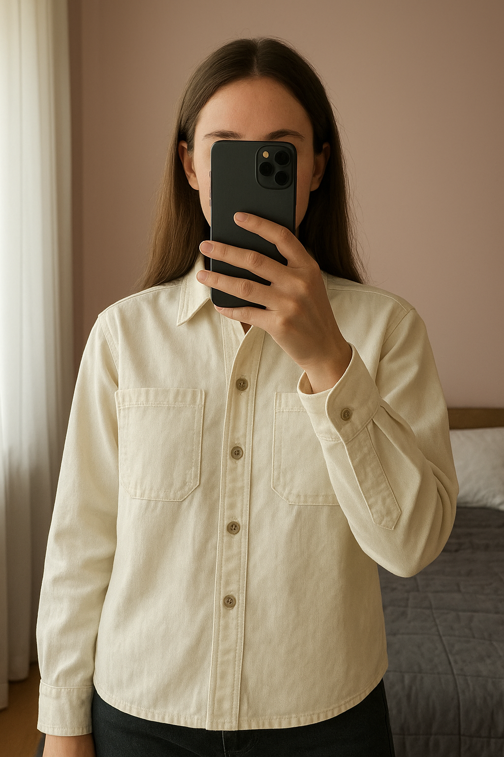 Veste Pull&Bear debout, face à la caméra, dans une chambre à la lumière douce, avec une lumière naturelle filtrant par la fenêtre.