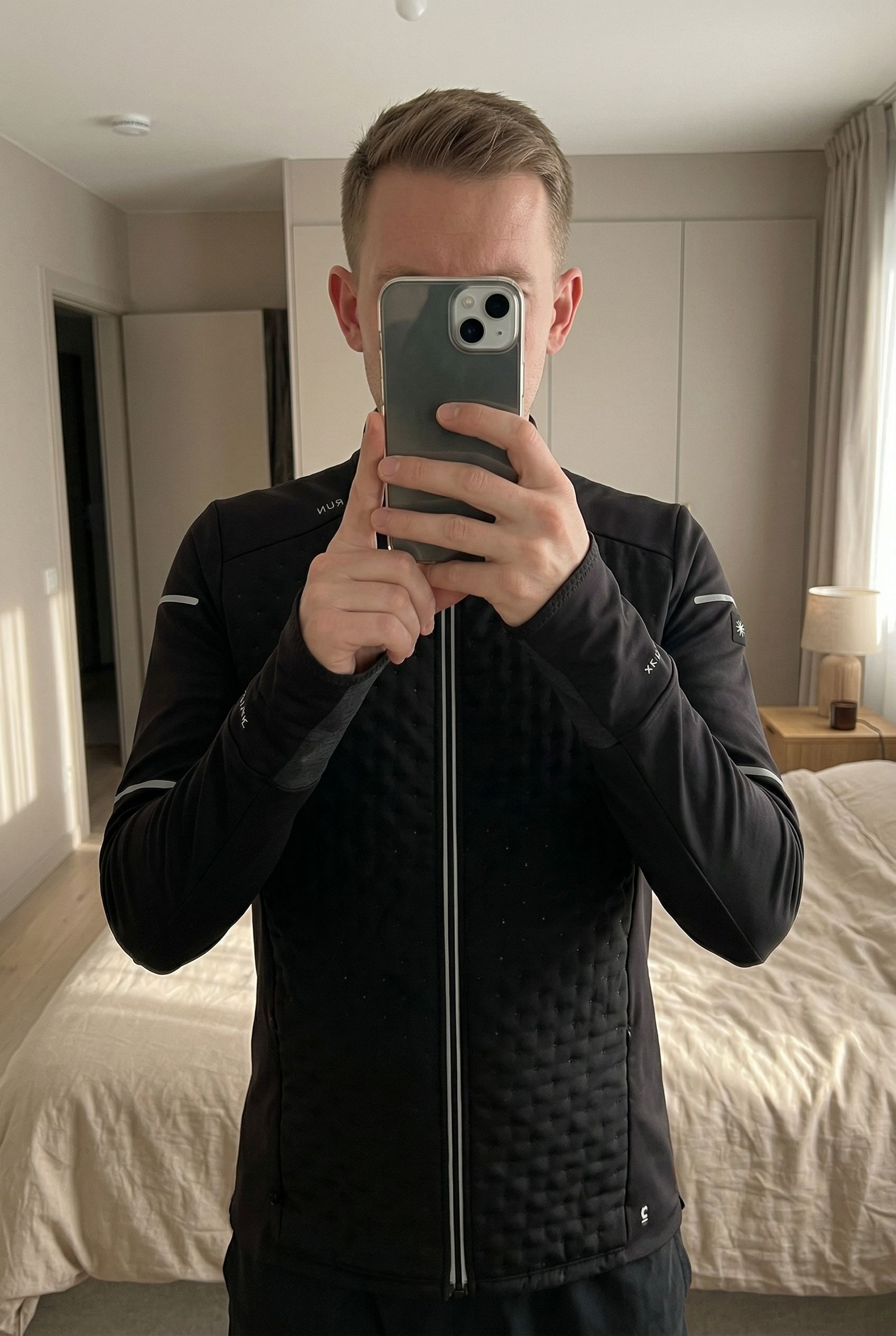 Veste running Decathlon debout, face à la caméra, dans une chambre à la lumière douce, avec une lumière naturelle filtrant par la fenêtre.