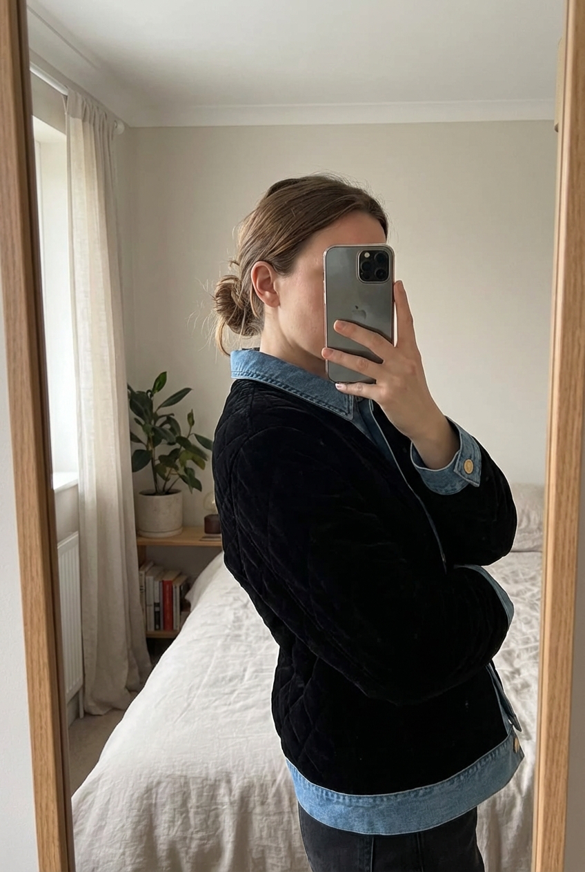Une personne en Veste sandro velour noir matelassée T38 neuf cambrant légèrement le dos pour une pose dynamique, dans une chambre à la lumière douce, avec une lumière naturelle filtrant par la fenêtre.