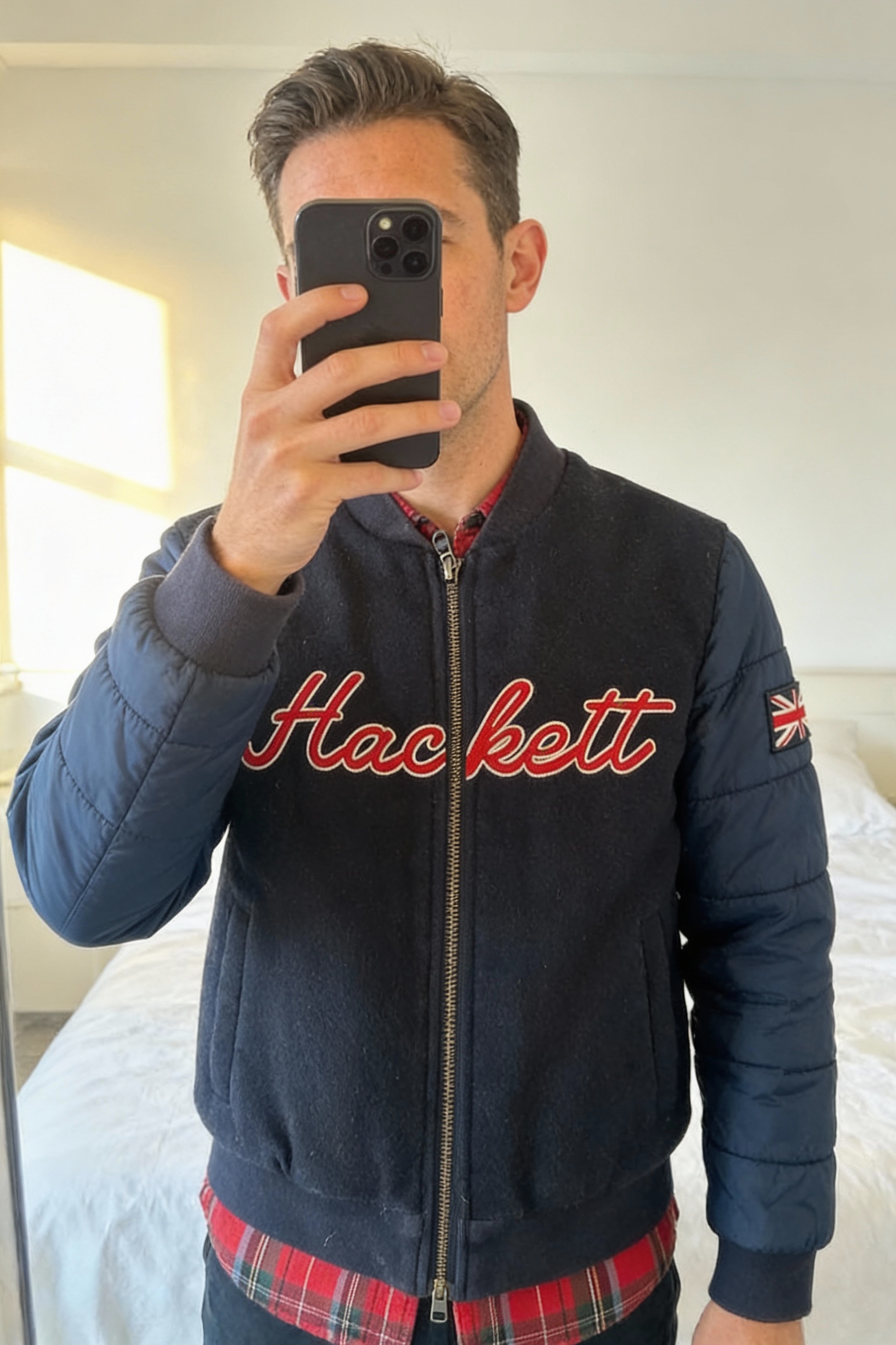 Veste Teddy avec manche doudoune Hackett debout, face à la caméra, dans une chambre à la lumière douce, avec une lumière naturelle filtrant par la fenêtre.
