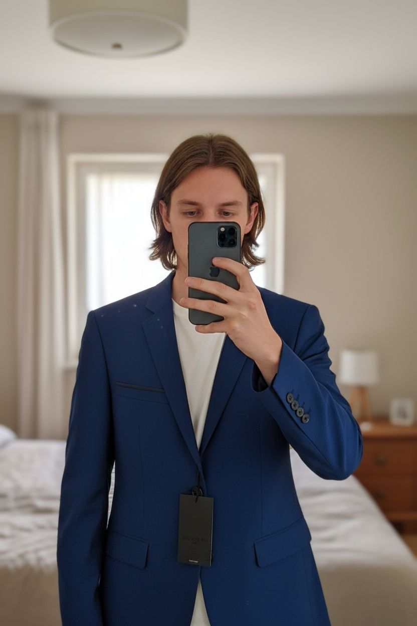 Veste The Kooples bleue laine NEUVE 🏷 debout, face à la caméra, dans une chambre à la lumière douce, avec une lumière naturelle filtrant par la fenêtre.