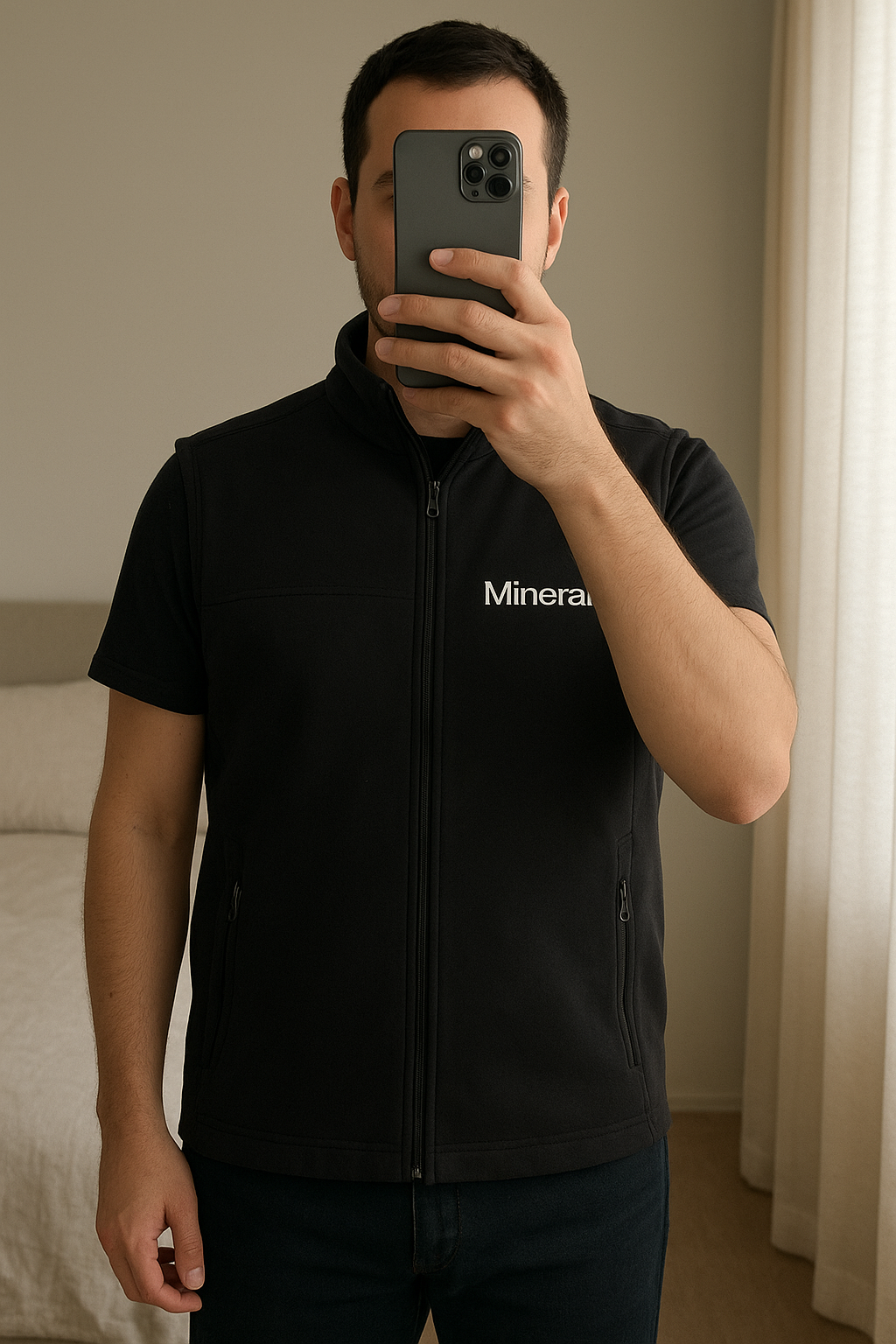 Veste The North à col face sans manche vintage Homme XL debout, face à la caméra, dans une chambre à la lumière douce, avec une lumière naturelle filtrant par la fenêtre.