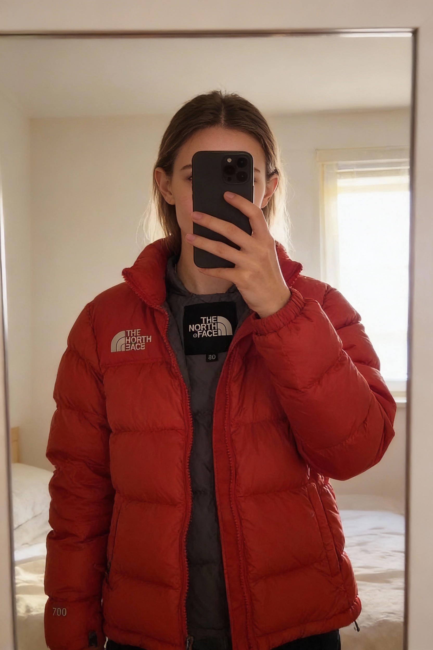 Veste tnf 700 rouge taille S Doudoune The North Face 700 femme rouge – Taille S debout, face à la caméra, dans une chambre à la lumière douce, avec une lumière naturelle filtrant par la fenêtre.