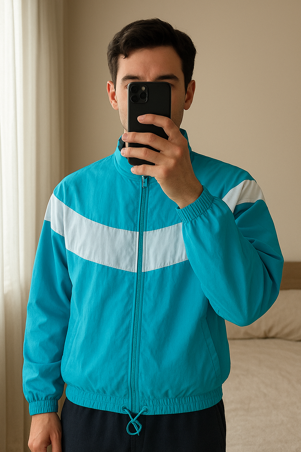 Veste vintage 90s turquoise & blanc unisexe - Taille 42/44 - old-school track jacket – Taille L debout, face à la caméra, dans une chambre à la lumière douce, avec une lumière naturelle filtrant par la fenêtre.