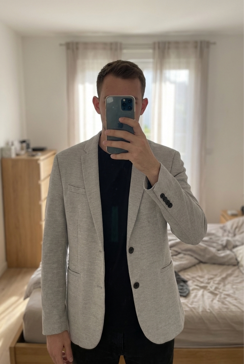 Veste Zara grise taille S Homme debout, face à la caméra, dans une chambre à la lumière douce, avec une lumière naturelle filtrant par la fenêtre.