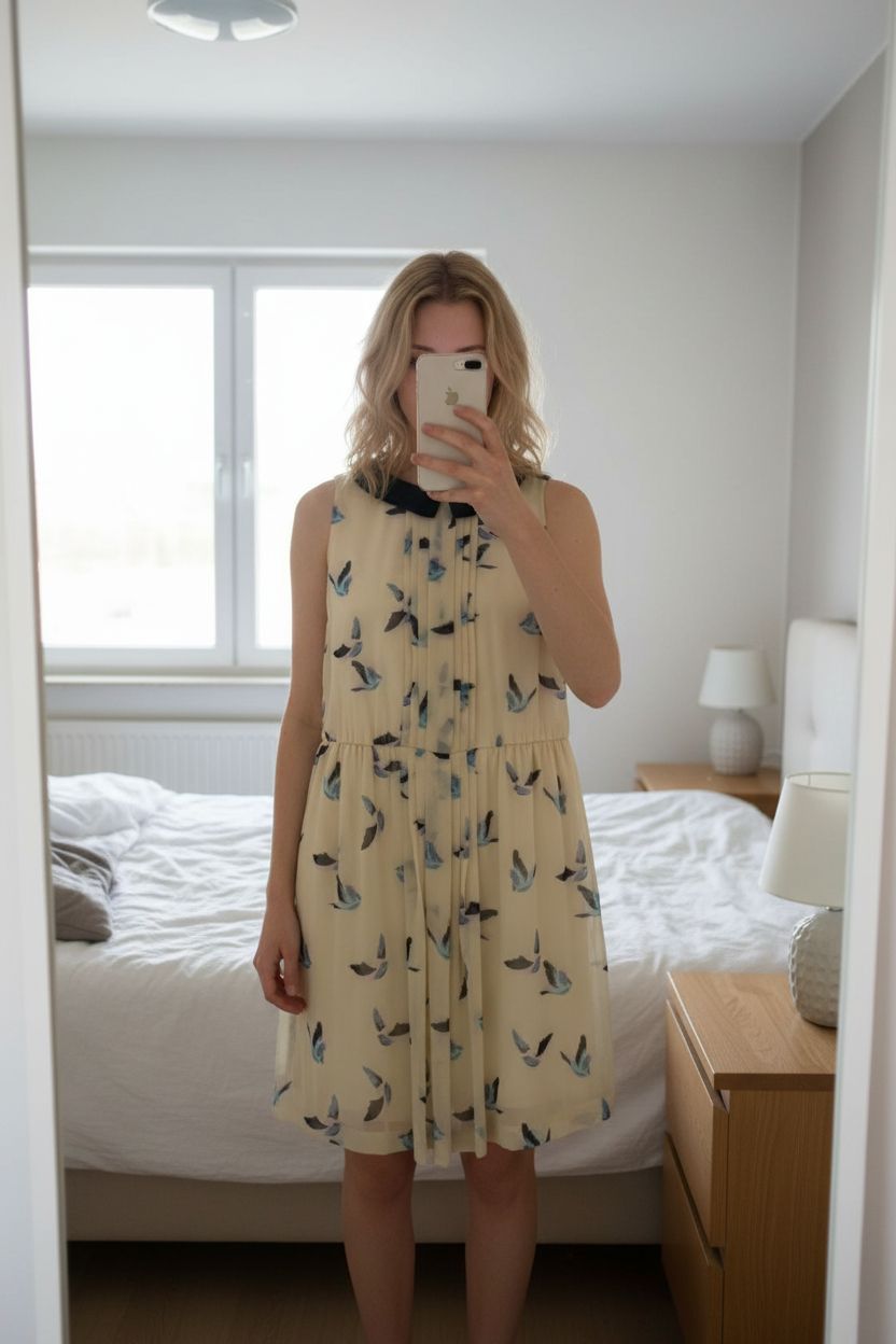 Vestido de passarinhos em pé, de frente para a câmera, em um quarto com iluminação suave e luz natural filtrando pela janela.
