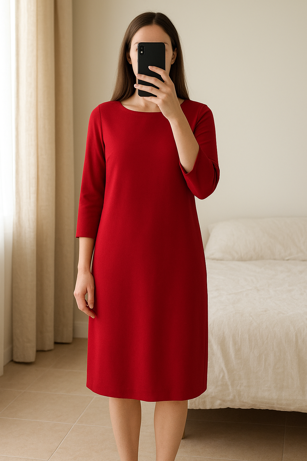 Vestito - Abito donna rosso VICOLO👗 in piedi, rivolto verso la fotocamera, in una camera da letto con luce soffusa e luce naturale che filtra dalla finestra.