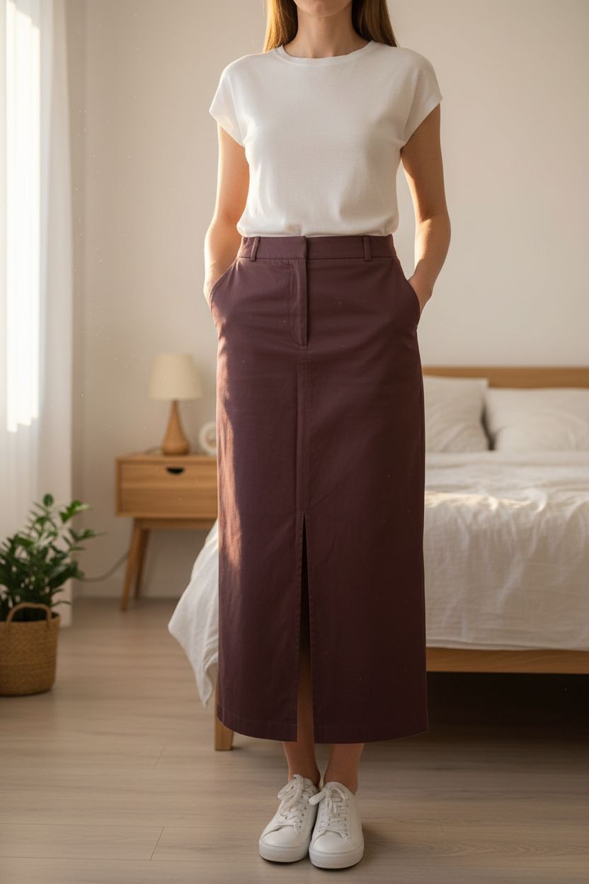 Viventy by Bernd Berger, aubergine-farbener, Maxirock, Größe 38 aufrecht stehend, der Kamera zugewandt, in einem sanft beleuchteten Schlafzimmer, mit natürlichem Licht, das durch ein Fenster fällt.