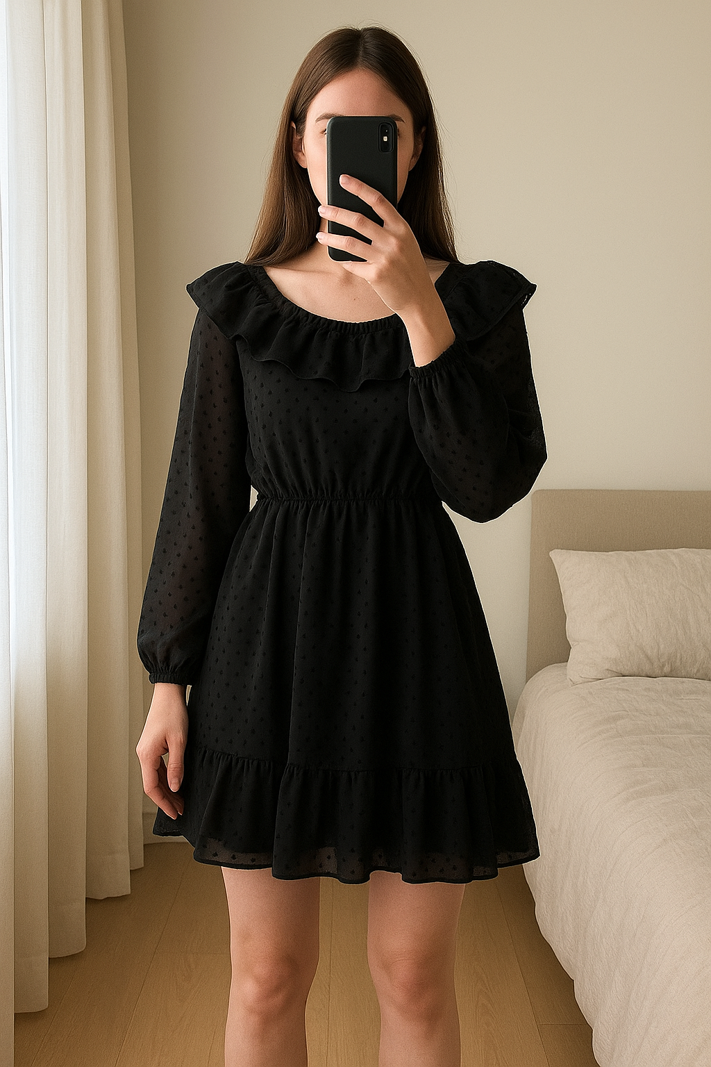Zara robe noir femme neuf avec étiquette debout, face à la caméra, dans une chambre à la lumière douce, avec une lumière naturelle filtrant par la fenêtre.
