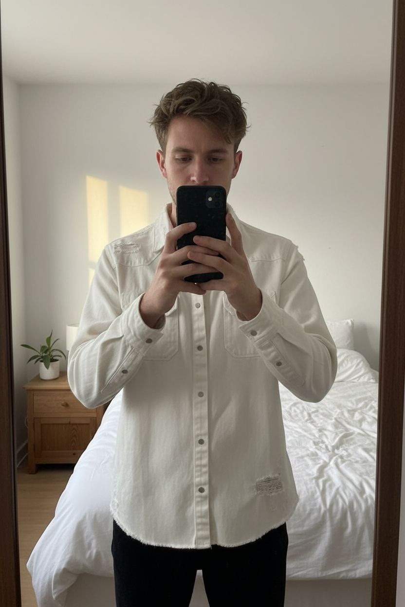 Zara - Veste en Jean Blanc crème - Taille L - Neuf debout, face à la caméra, dans une chambre à la lumière douce, avec une lumière naturelle filtrant par la fenêtre.