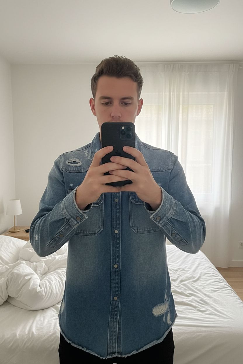 Zara - Veste en Jean Bleu - Neuf - Taille XL debout, face à la caméra, dans une chambre à la lumière douce, avec une lumière naturelle filtrant par la fenêtre.