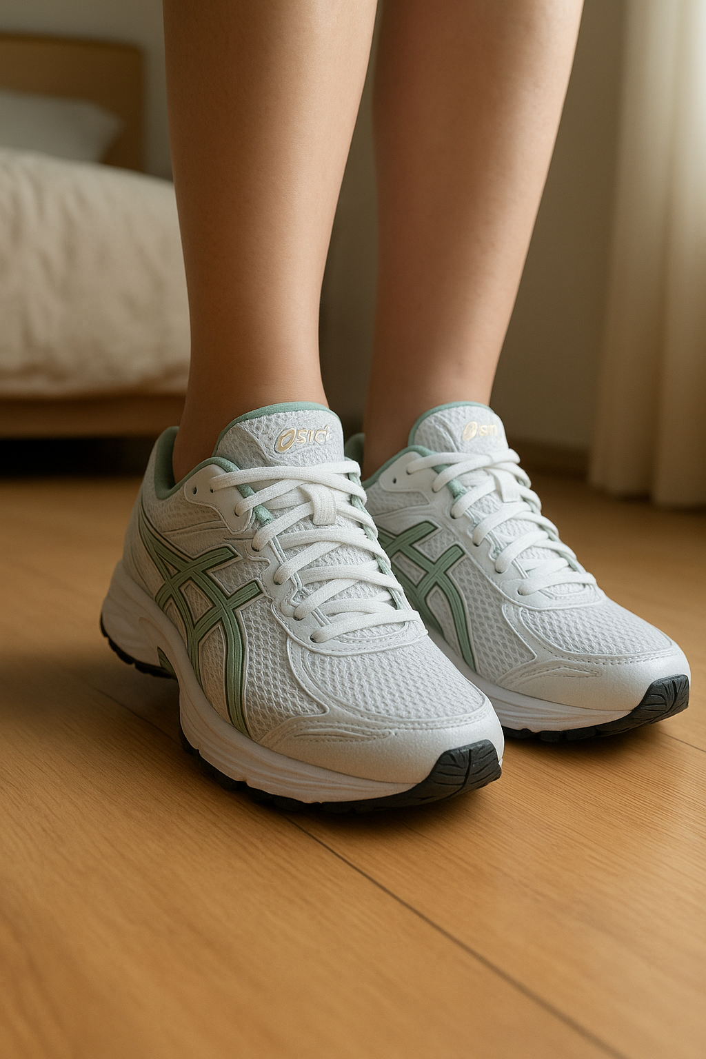 Asics Gel-Kayano 14 - White/Slate Grey debout, face à la caméra, dans une chambre à la lumière douce, avec une lumière naturelle filtrant par la fenêtre.