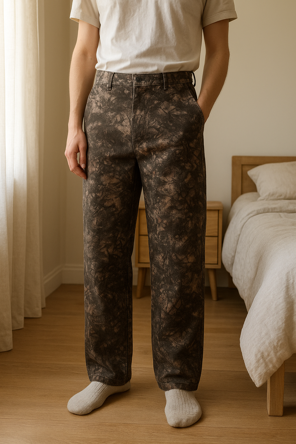 Baggy camo weekday woodland realtree in piedi, rivolto verso la fotocamera, in una camera da letto con luce soffusa e luce naturale che filtra dalla finestra.